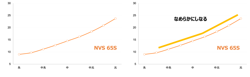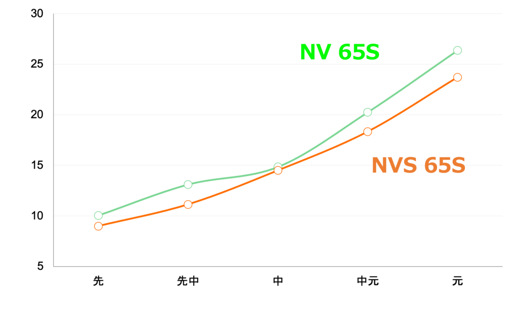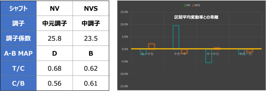 スペックによって違いはあるものの、NVは中元調子、NVSは中調子のシャフトのようです。