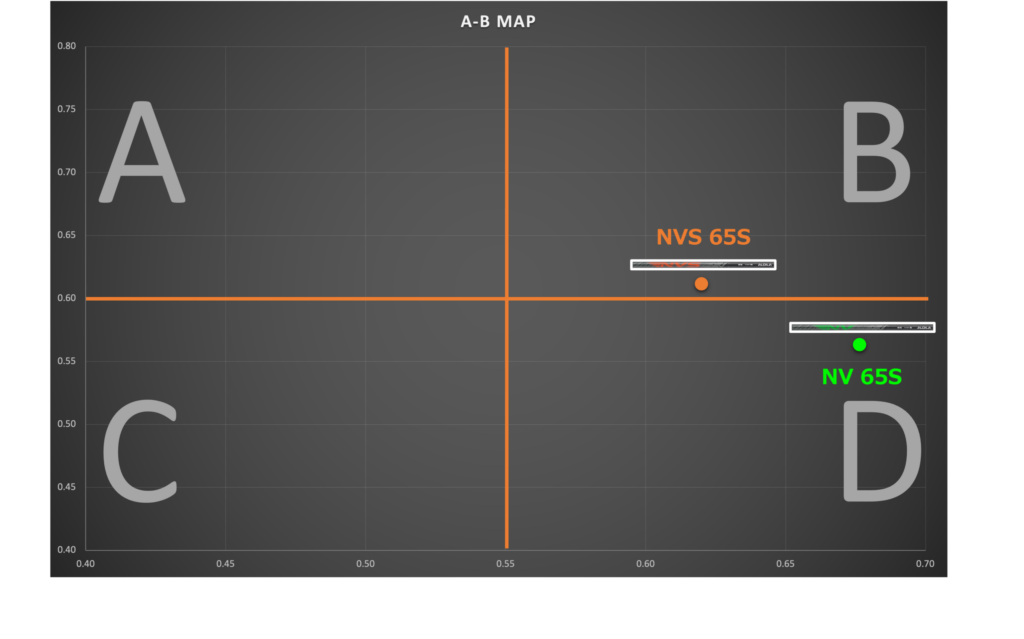 そして比較するとやっぱりNVは手元側、NVSは全体が動く中調子で、相対的に先が動いて球が上がりやすいと思います。
