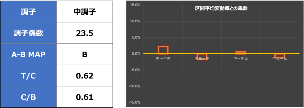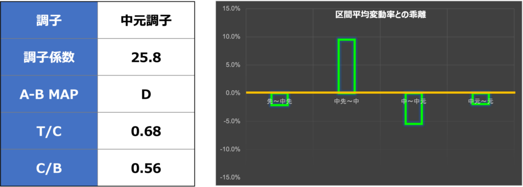 区間平均変動率との乖離は非常に少なく、元から中元中から先中が少し動きそう。